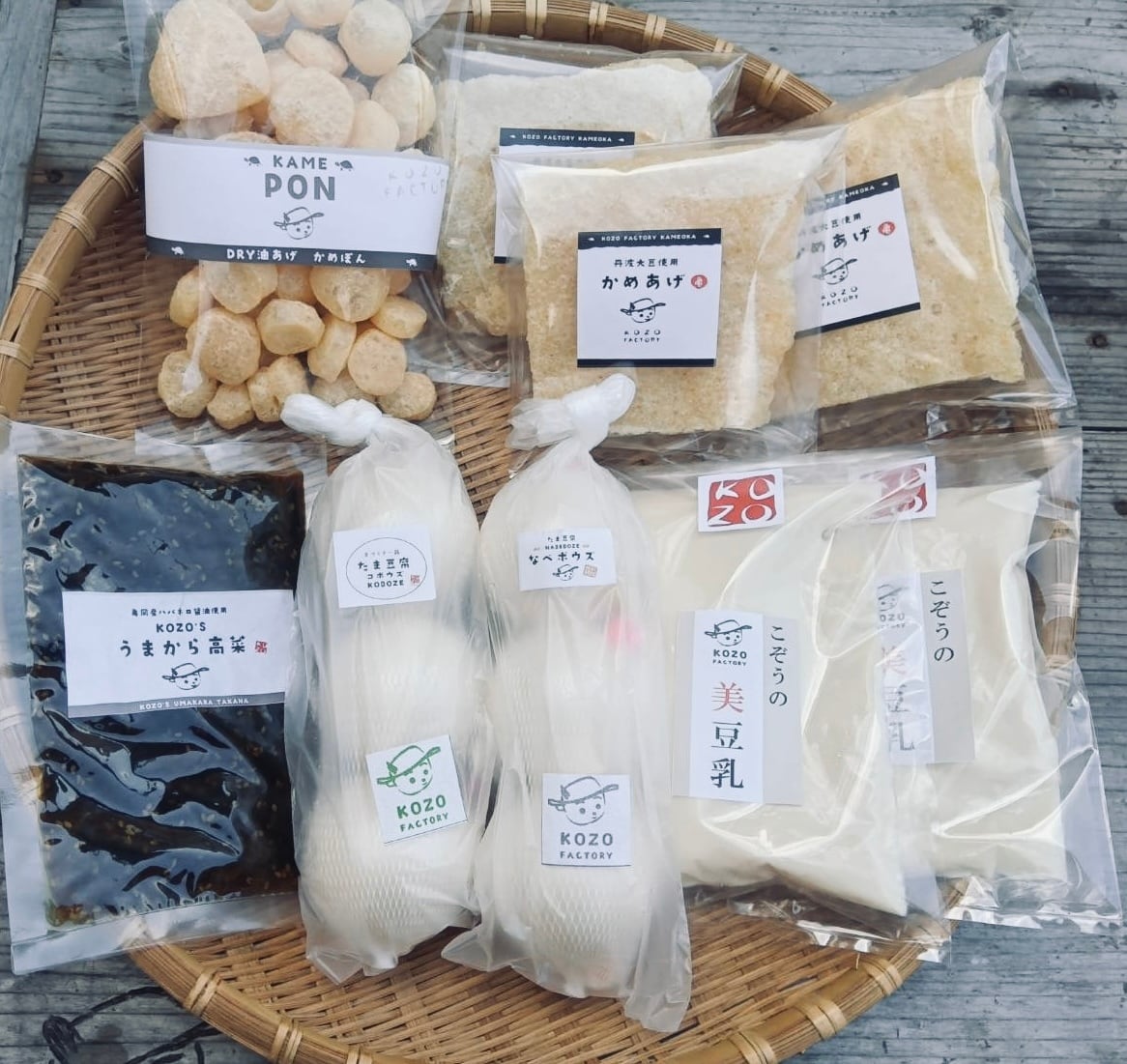 たま豆腐“コボウズ”3球セット×1 “なべボウズ”3球セット×1 KOZOの美豆乳200g×2 かめあげ2枚入り×3 かめポンハート♡バージョン KOZOのうまから高菜のお得詰め合わせセットです。